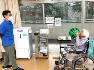 1Fでは職員とご利用者1対1で、ビーチボールを使ったボール投げを行いました。うまくキ