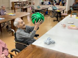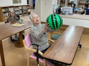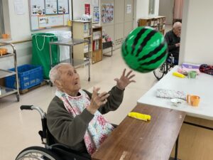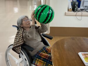 ず、手を伸ばすご利用者もいれば、ただ笑いながらボールの行方を追うご利用者もいるなど、楽