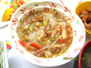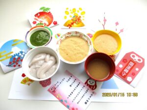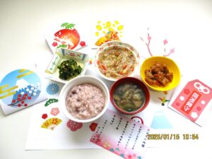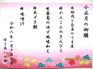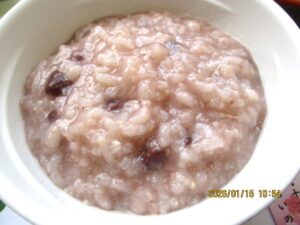 ということで、ゆうあいの郷では、1月15日の小正月の昼食に、小豆粥を中心とした行事食
