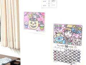 が、ここゆうあいの郷でも、ご利用者の塗り絵などを、フロア内で飾り、少しでもハロウィンの雰囲気を