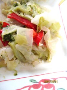 キャベツ、ブロッコリー、赤ピーマンの野菜を、胡麻ドレッシングで和えたもので、マヨネーズベースで