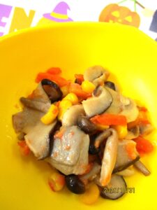 たくさんの、シイタケ、しめじ、エリンギの、きのこ類の風味、食感、そして人参、コーンの彩りも良