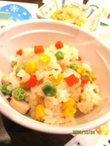 グリーンピースの緑、パプリカの赤、コーンの黄色が彩り豊かで、まさにクリスマス仕様、クリスマスツリーのよう